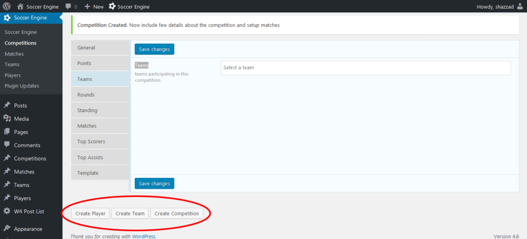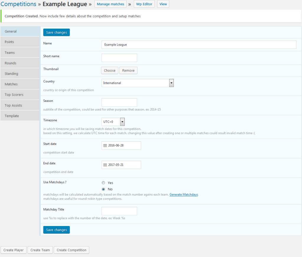 Competitions are like season of a tournament. To create a competition, Click on Competitions link under Soccer Engine menu, and then click on add new.