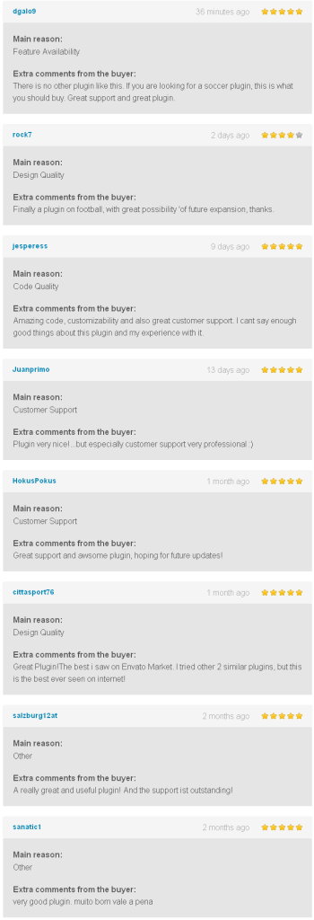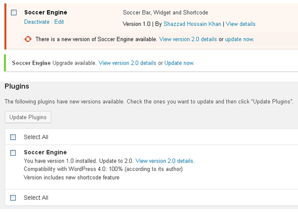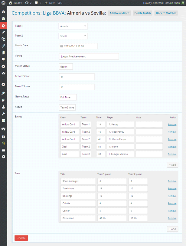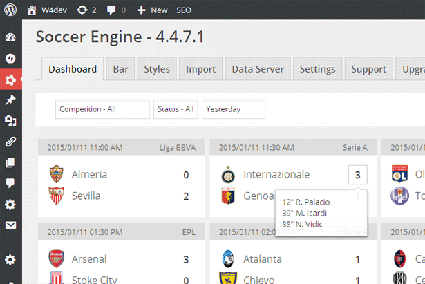 Version: 4.7 - September 26 - 2017 - New - Standing table columns can be ordered using "standing_columns" parameter name. - New - [wpse_match_title title_meta_first="true"] - to display dates, competition name, round name on top of team/scores - New - Display matches by date range. ex: [wpse_matches date_between="today 00:00, tomorrow 23:00" hide_more=1 per_page=9999]. Any date value that can be formatted with strtotime function is accepted. Version: 4.5.9 - September 11 - 2015 - New Shortcode - [wpse_gamebox] - The static floating bar - Competition Rounds. - Automatic Standing table. - Automatic Top Scorers table. - New competition tab - Teams - Start with last open tab - Included Tinymce button - Standing table for League without creating fixtures. - Top scorer appearance and assistance. - Match player management. - Improved UI - Improved Plugin update feature. Version: 4.5.8 - May 08 - 2015 -- New: Bar match click action - Modal or Redirect -- New: Auto/manual top scorers from match data. -- Fix: All translation were missing Version: 4.5.7 - April 06 - 2015 -- New: Competition Top Scorer -- Improved: Bar template, color, responsiveness & smoothness Version: 4.5.6 - March 24 - 2015 -- New: Suspension Point For Competition -- Improved: Single Match Page Version: 4.5.5 - March 20 - 2015 -- New: Soocer Engine Admin Bar -- New: Shortcode [wpse_match] to display match card Version: 4.5.4 - March 17 - 2015 -- Fix: Frontend Template content -- Fix: Imported Live Matches data Version: 4.5.3 - February 18 - 2015 -- New: Frontend template content -- Fix: Competition table pagination -- New: Choose different language for front/back end Version: 4.5.2 - February 13 - 2015 -- New: Matchday Shortcode. Usage - [wpse_competition_matchdays id=x]. -- New: Portugese Translations -- New: Display matches filtered by home/away teams Version: 4.5 - January 20 - 2015 -- Improved: Importer, now competitions data import would work perfectly -- New: When events are hidden, it can be viewed by clicking on the match row -- New: Spanish Translation -- Fix: Competition table action links Version: 4.4.9 - January 15 - 2015 -- Fixed: Invalid date issue on imported competitions Version: 4.4.7 - January 9 - 2015 -- New: Teams Dropdown -- New: Custom Styles -- New: Admin Support Page -- Improved: Admin UI Version: 4.4.4 - December 12 - 2014 -- Improved: Now all shortcodes allow commong arguments -- New: Shortcode [wpse_team_form] to display current form of a team Version: 4.4.3 - December 7 - 2014 -- Fixed: The toolbar don’t display more than 5 competitions -- Fixed: [wpse_team] shortcode don't display custom created teams statistics -- Improved: [wpse_team] shortcode to highlight a team Version 4.4.2 - December 6 - 2014 -- Fixed: Standing Points -- New: Reorder soccer engine admin menu position -- Improved: Translation. Version 4.4.1 - December 5 - 2014 -- New: Assign Win/loose/draw points -- Improved: Standing Shortcode. [wpse_standing limit=10 offset=5] -- Improved: Dashboard Filter. -- New: French Translation Version 4.4 - December 3 - 2014 -- German & Italian translation included Version 4.3 - December 2 - 2014 -- Auto upgrade imported competitions using cronjob. -- Improved: Importer to run import process in chuck and update only 50 matches data per chunk. Version 4.2 - November 30 - 2014 -- New: Tournament type competitions Version 4.1 - November 22 - 2014 -- Fixed: Competition creation bug -- New: Drag & Drop bar competition ordering Version 4.0 - October 17 - 2014 -- Improved: Now Native WordPress Importer will also import team logo, tournament logo. -- New: Team Template Version 3.0 - October 14 - 2014 -- New: Match Events Version 2.0 - October 11 - 2014 Version 1.0 - October 6 - 2014