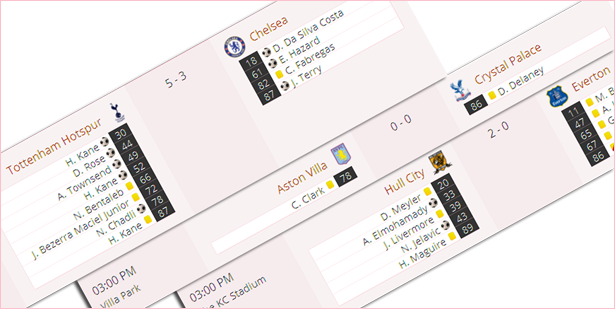 - Match Events – scorers, bookings, cards, penalties, substitutions, man of the match